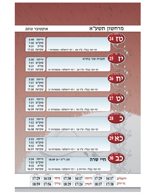 הלוח כולל זמני היום וזמני שבת בארץ ובחו"ל.